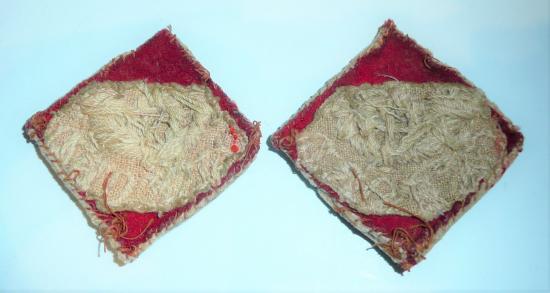 Cut down from the shoulder epaulettes and edged with a white border. Heavily woven white on scarlet, some edge wear removed from uniform. Each circa 4.5cm square. One of which (the forward facing one may have been worn on the sun helmet pagri cloth). Rare.