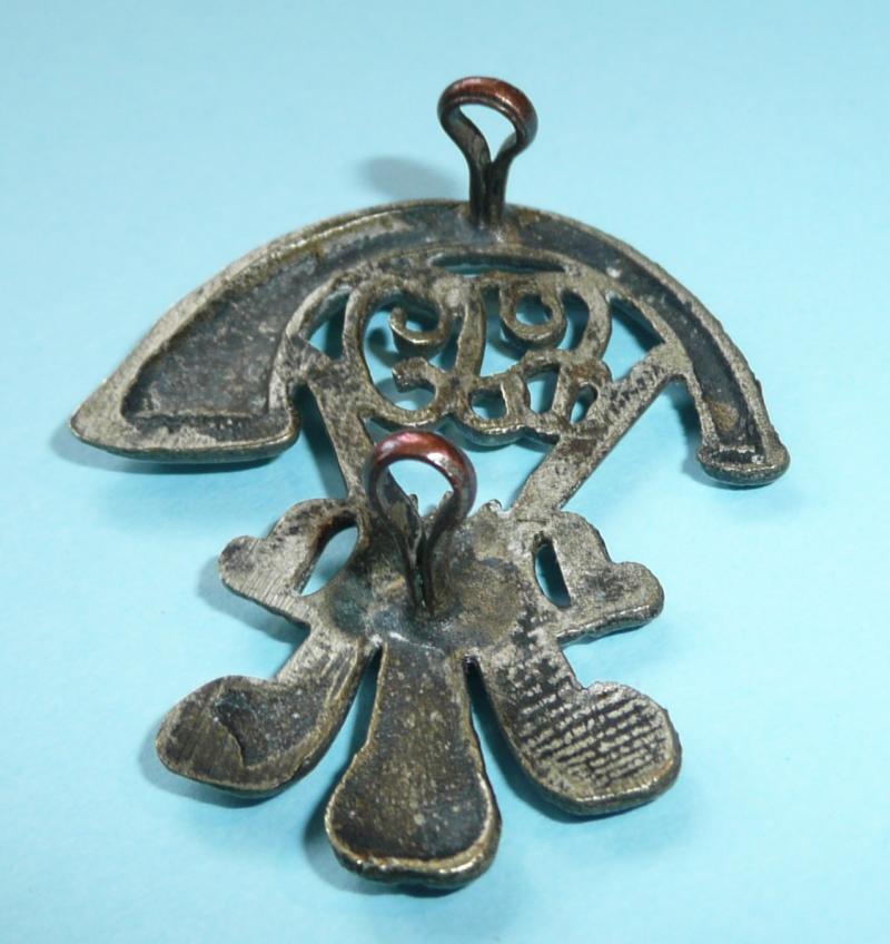 A locally finely cast example with two original loops to the reverse. Circa 42mm tall. Probably silver plated. Circa 1881 - 1949. In very good condition.