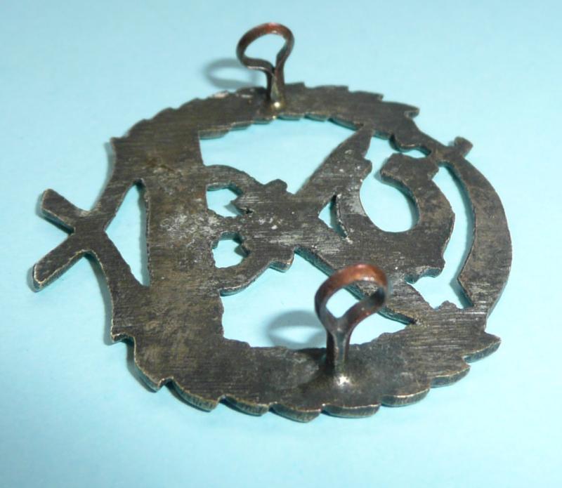 A finely cast and voided white metal example with two original copper loops to the reverse. A 'C' in the centre above two daggers, a scroll below 'BARODA'. In very good condition. Pre WW2.