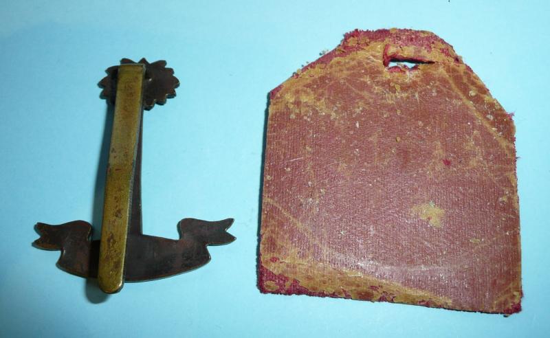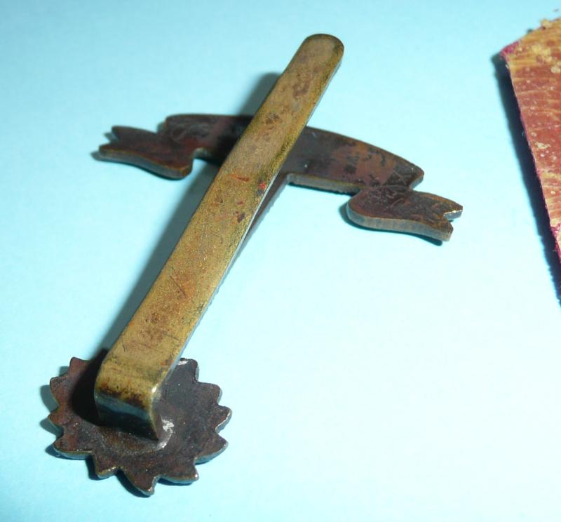 Die cast in bronze and mounted on what appears to be an original badge backing in red cloth, with long original thin slider presumably for wear in the pagri band of the sun helmet. Some service wear but a pleasing example.