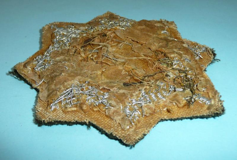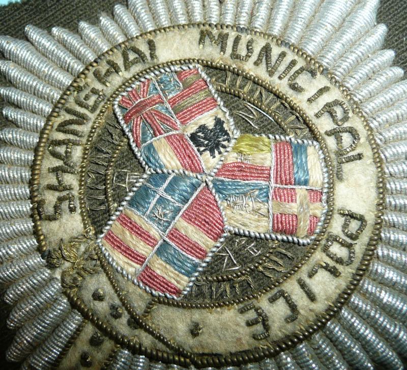 A scarce original pre 1943 period 'Shanghai Municipal Police blazer badge'; large silver wire eight pointed star mounted with gilt wire strap inscribed 'Shanghai Municipal Police'; the centre with multi coloured woven flags of the nations represented in this International Settlement, set on the motto 'Omnia juncta in uno' (All joined together into one), the reverse with partial brown paper backing. Good condition but with minor age wear. Also not all of the small flags are a good representation of the nations, the USA flag is in the wrong colours and silver has been used in place of yellow on a few others but this is typical of hand embroidered items. Circa 102 x 108mm. Rare.