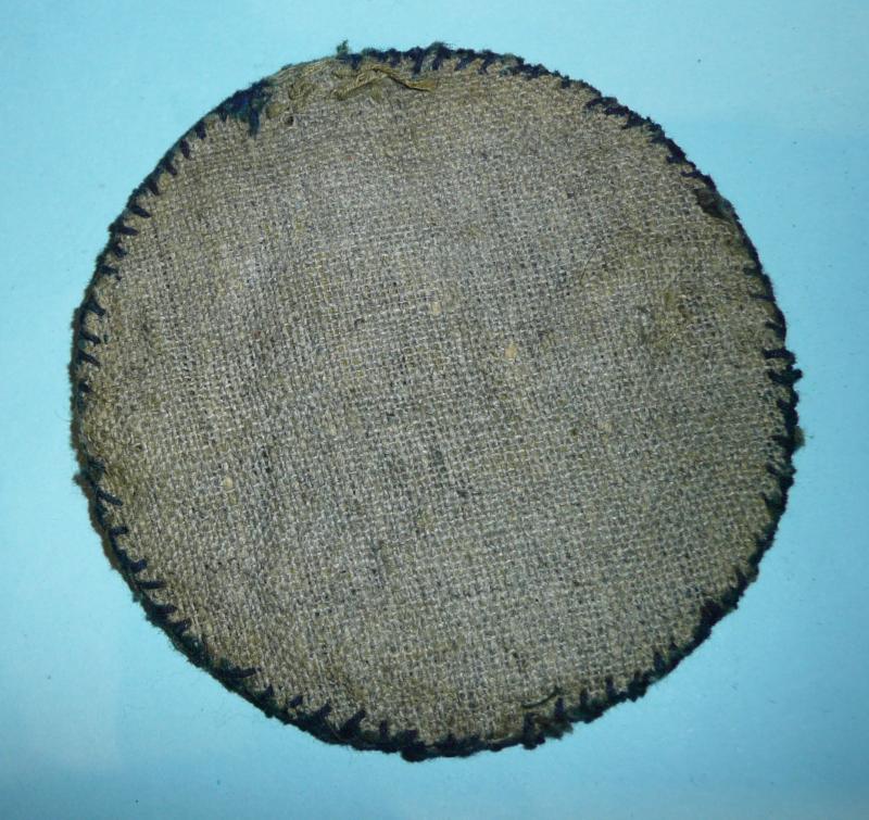 A finely woven yellow on blue embroidered Chinthern formation sign, slightly padded, sewn to a circle of grey linen cloth backing. Circa 7cms in diameter. In very good condition.