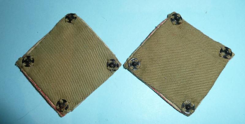 A matched and facing pair of printed red leaping gazelles in a white circle in a red square with a narrow white border, folded for wear and sewn to Khaki Drill backings with four press stud poppers to the reverse of each. The stylized version. ln very good overall condition. According to Oliver Lock (Airborne Insignia Vol 2) also worn by those Italians who had opted to fight on the allies side as F Recce Squadron.