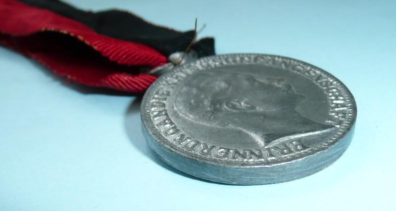 Made in a soft white metal alloy, silver washed (possibly has some lead in it, so please wash hands after handling). Circa 33mm in diameter, with a steel metal ring for suspension and a fairly long piece of silk ribbon attached (red /maroon and black) which came with it and which is circa 23 cms / 9 inches. Some fraying to cut edges otherwise in good condition and looks contemporary with the medal. Medal is VF condition with some edge knocks and light marks.