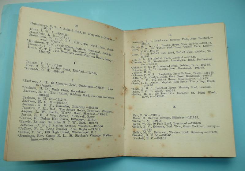An interesting pocket sized booklet with card covers relating to Brentwood Public School, situated in the County of Essex. A useful resource for anybody collecting WW1 or WW2 medals or researching Old Brentwoods more generally. It gives the postal address and dates each old boy attended the School. Some minor marks to covers and gentle corner-wear and light foxing to pages, otherwise in very good condition with no annotations, missing pages or tears or repairs. 56pp. Scarce.