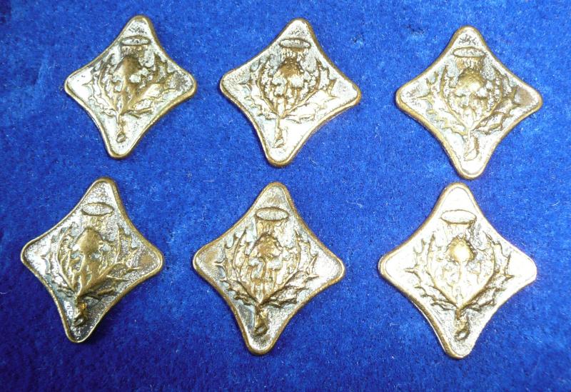 An old set of silver washed cast brass buttons, removed from uniform, complete with shanks (one twisted but still functional), blank reverse. All of the same design and 'look', from the front, so a good useful matching set. The detail of the thistle is not crisp on these buttons as they have been cast, but a charming set nonetheless. All of the same size at circa 26mm tall and 23mm wide. A diamond pattern button was often worn by Scottish military pipers but these do not appear to be of military issue. Bling up your Highland gear!