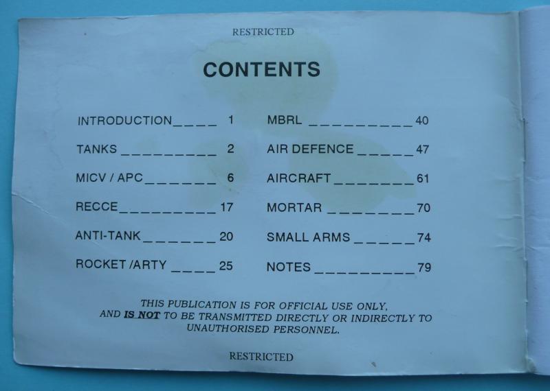 Pocket sized guide, card covers, 79pp, has been used as seen from the wear to front cover, but a tight copy with clean undamaged pages and illustrations. Deals with everything from small arms to aircraft and everything in between. Produced for the services engaged in the conflict by the Intelligence Corps.