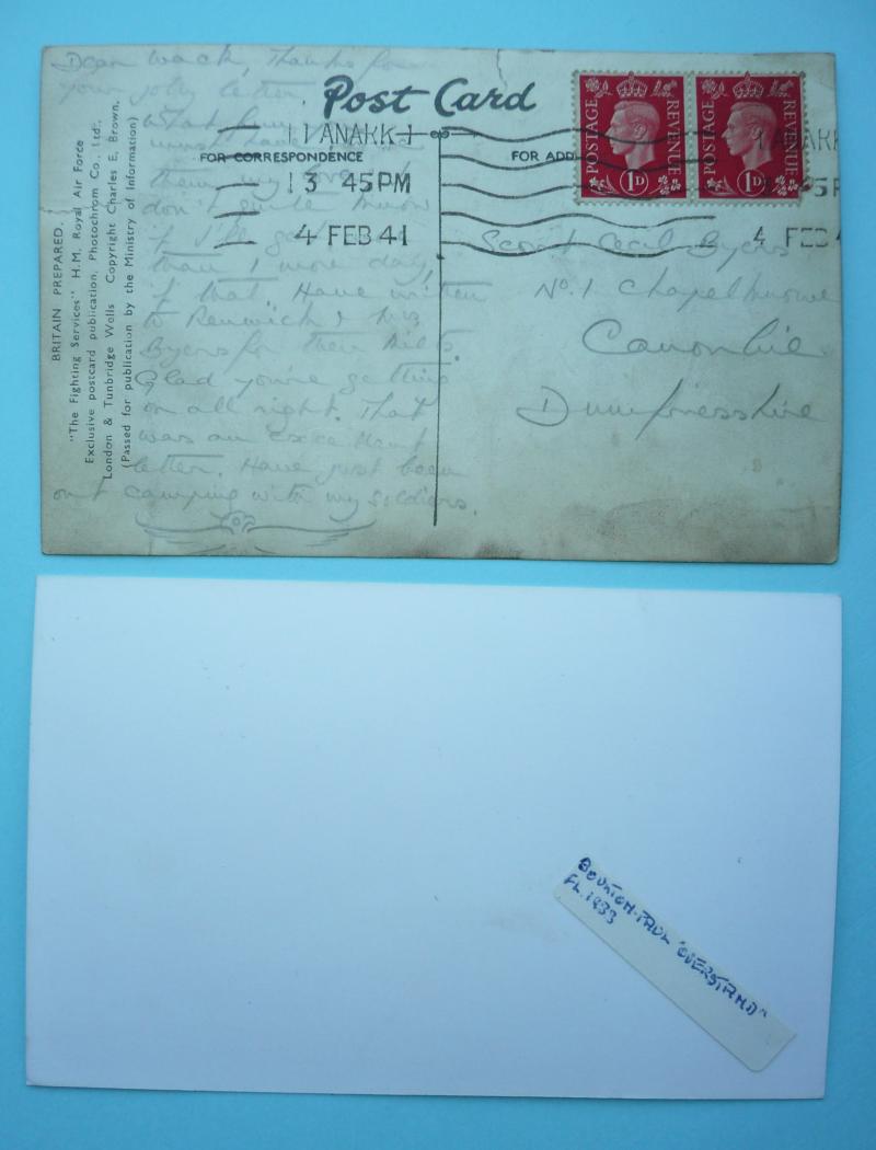 An original 1941 postally used postcard of a flight of B & P (Boutlon Paul) Overstrands. Some small tears and edge crease but a scarce image of this biplane Also a modern copy of a photograph taken circa 1933 of an stationary Overstrand with its crew.