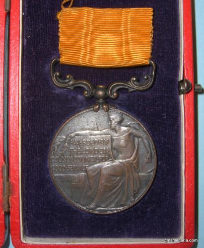 c) London County Council (LCC) London Fire Brigade Good service bronze medal (in fitted case of issue - Vaughtons Ltd, Goldsmiths & Medallists, Birmingham), ornate swivel supsender, short length of correct gold/yellow silk ribbon. Engraved in upright capitals to Fireman T. Luck.Medal GVF+, some minor surface marks.