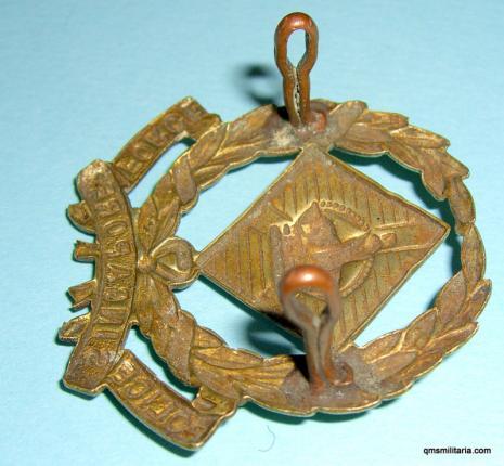 A scarce pre 1952 cap badge. Some polishing to highpoints, with two long loops to reverse. The reverse shots of the badge look brassy on the photos but it is actually white metal. Circa 3.8cm tall and 4cm wide. Very scarce.