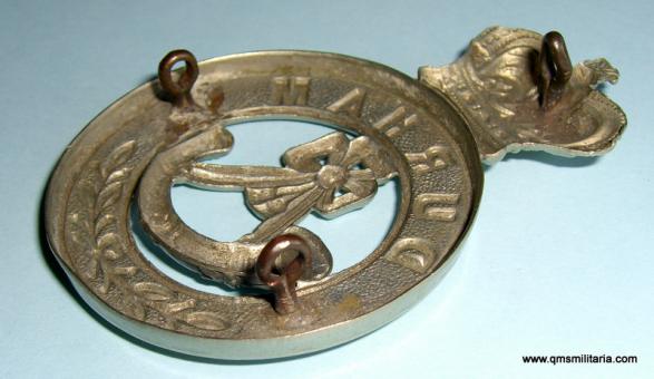 A very scarce badge as worn by the militia, often mistakenly attributed to the volunteers, with three orginal dark toned lugs to the reverse. The badge is in good condition with sharp detail. The only fault is minor damage to the two of the little studs on the top of the orb of the crown (see photo). Circa 7cm tall and 4.8cm wide. Worn circa 1887 - 1896.