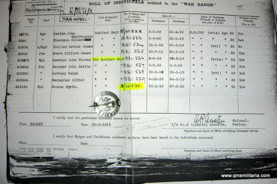 WW1 Silver War Badge (SWB) Number B211530 - 5th Bedford Regiment - Corporal Cyril Course