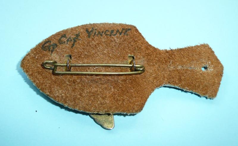 An original shirt buttonhole fob style badge maker marked Fraisse Paris with the code G2793 to reverse of metal part. Leather strap and pin. Leather annotated on reverse with the name "