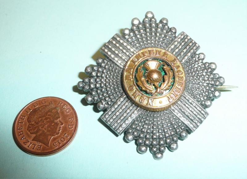 A two-part constructed cap star silver plated and gilt with green translucent enamel to centre and an original stout pin and C clasp fitting to the rear. Circa 5cms across. Worn on the Glengarry and Balmoral cap. An early example with some dulling to gilt and silver plate dark toned otherwise in very good condition.