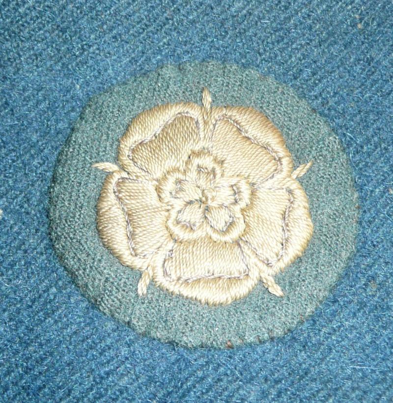 A stunning and rare WW1 brassard with an embroidered white rose on a pale grey circular formation sign sewn to a blue cloth arm brassard; buckles never fitted.