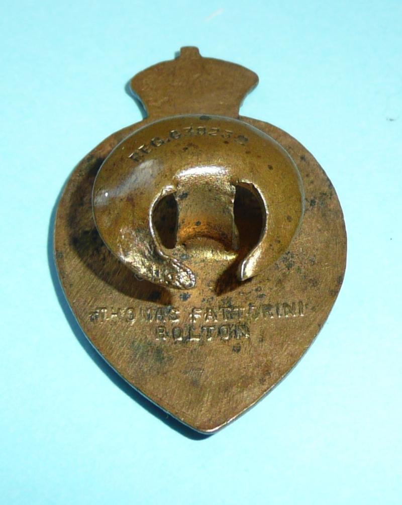 A scarce lapel button in very good condition for age and with no damage to enamel. A crowned 'pear -shaped' example, blue enamel title to border, the centre depicting the old Welsh Town Arms, a golden eagle surmounting a shield bearing three lion in pale on red enamel ground. Original horseshoe fitting with registered design number 638232 to reverse (which dates it to 1914) and maker marked Thomas Fattorini, Bolton. Some staining and dulling to gilt and a bit of damage to one tang on end of horseshoe fitting otherwise in good overall condition.