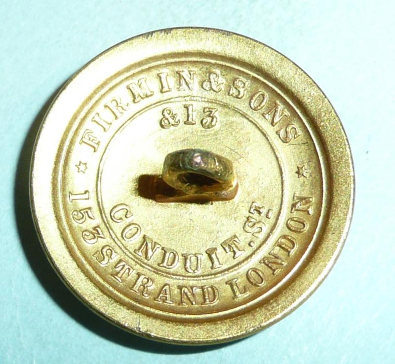 Circa 26mm in diameter, fixed shank, open backed and maker marked Firmin & Sons, 153 Strand & 13 Conduit St, London. Large gilt orderlies / Mess Waiter's button. QVC / Victorian crown. Gilt in good condition. This pattern of maker naming used 1856 - 1860 only. A stunning example. Rare.