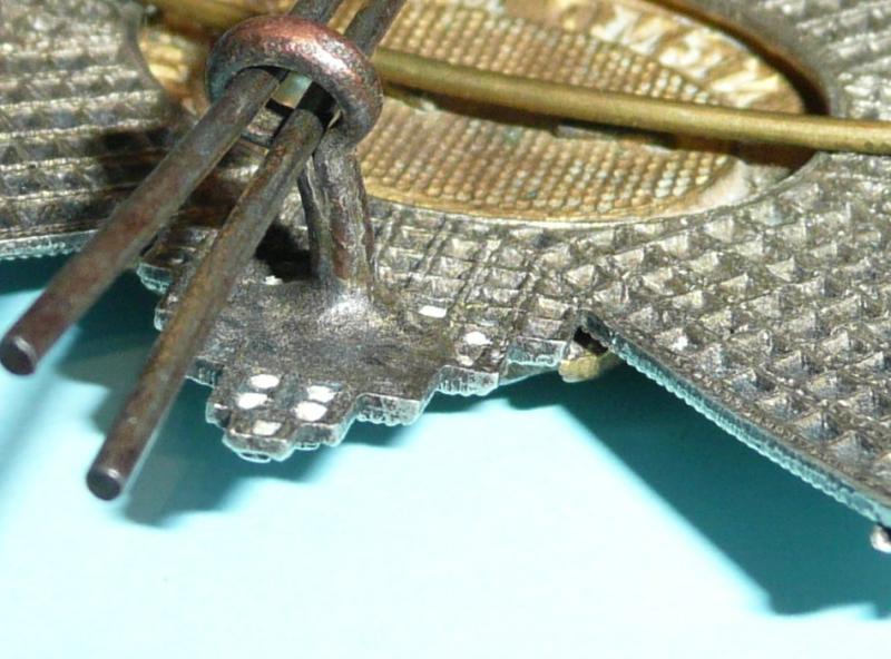 Three part construction, die struck, with original long loops and maker's tablet JR Gaunt London to reverse. Sharp detail and complete with fixing rod and cotter pin. Worn 1902 - 1936.