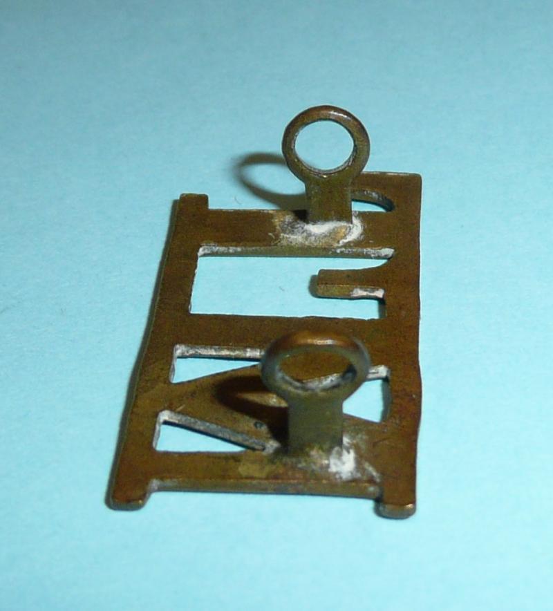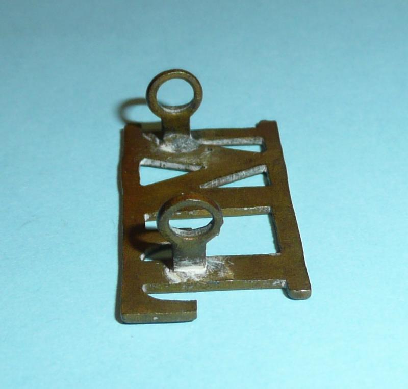 In good condition with two original flat connector style loops. Worn by members of the Army Service Corps (ASC) attached to motor transport companies. One of several patterns illustrated in Westlake. Circa 33mm wide and 17mm tall.