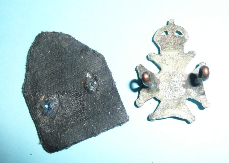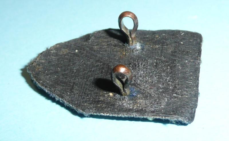 A small silver plated Royal Garhwal Rifles officer's field service cap badge, in the form of a King's crown above Maltese cross with regimental details in circle to centre and strung bugle. Circa 28mm tall with two original copper loops and mounted on an old piece of shaped blue backing cloth, added for display. Scarce. Worn circa 1922 - 1950. Allocated to India following Independence.