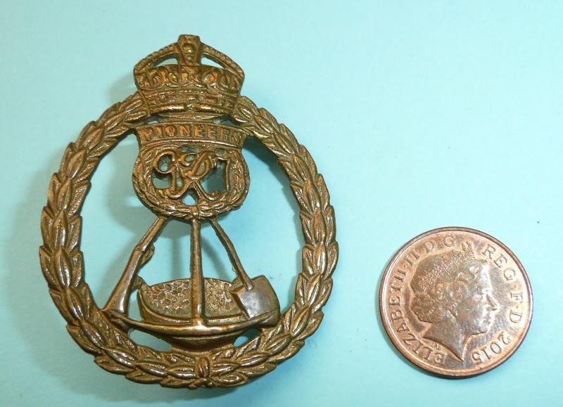 A large flat backed theatre cast example, nicely voided with a King's Crown above a scroll 'Pioneers' and GRI cypher to centre. Two original loops to reverse (slight twisting). A large badge at circa In very good condition. Circa 5.1cms tall. The owner claims it was worn 1940 - 1947, which seems to be supported by the information below.