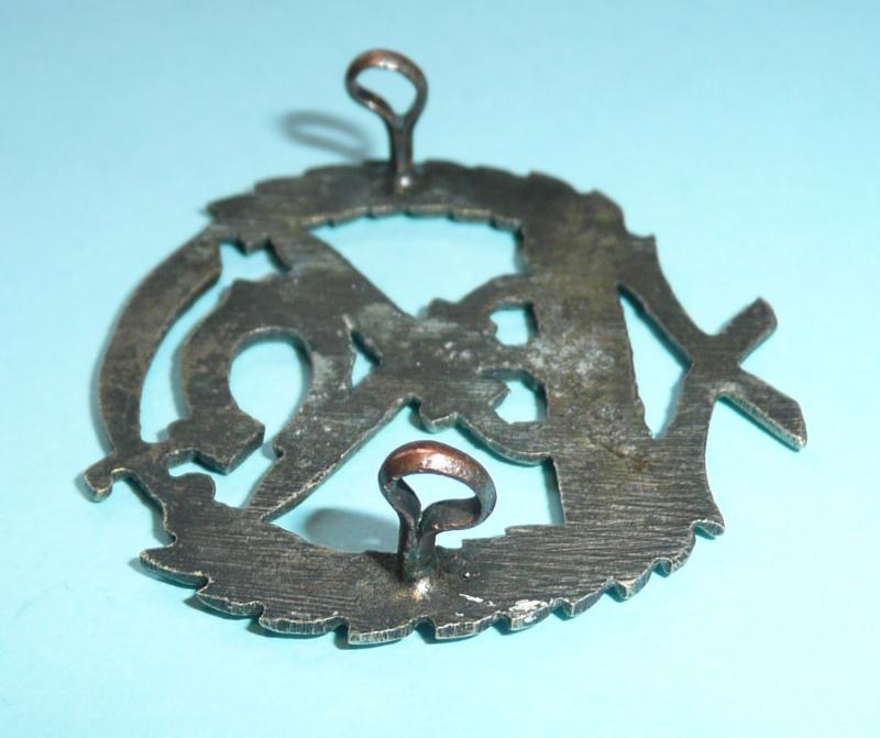 A finely cast and voided white metal example with two original copper loops to the reverse. A 'C' in the centre above two daggers, a scroll below 'BARODA'. In very good condition. Pre WW2.