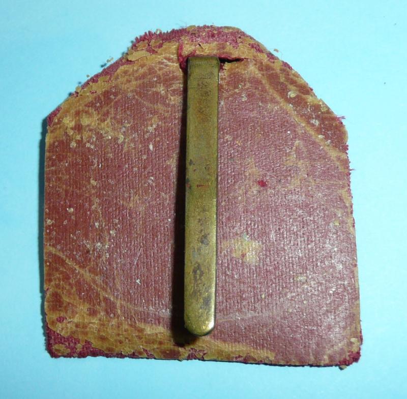Die cast in bronze and mounted on what appears to be an original badge backing in red cloth, with long original thin slider presumably for wear in the pagri band of the sun helmet. Some service wear but a pleasing example.