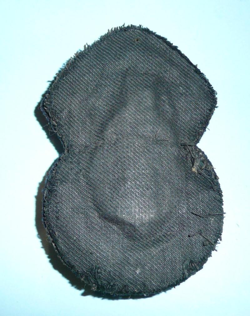 Removed from cap. A padded bullion wire example with embroidered crown and silver plated metal fouled anchor to centre, on black wool background. Hessian backed with strengthening bar. In good worn condition. Central jewel below crown is blue. They were worn with blue central jewels from 1920 onwards.