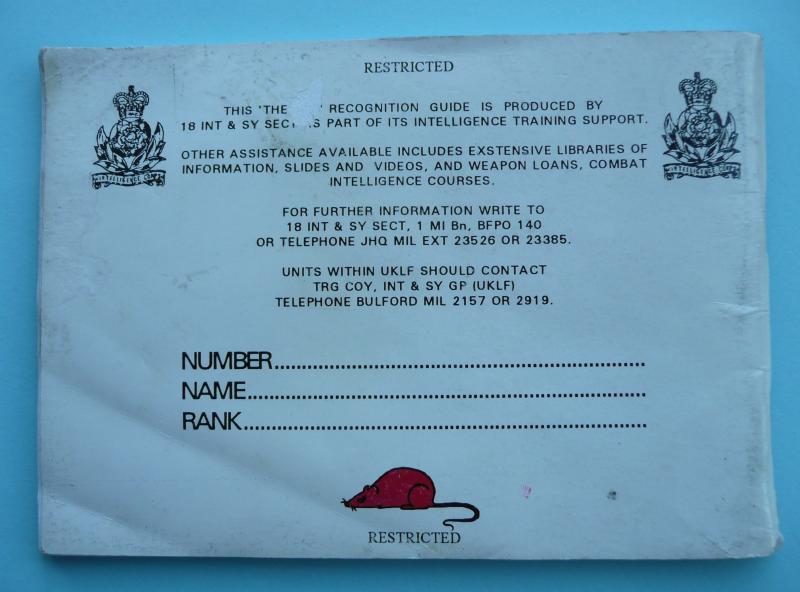 Pocket sized guide, card covers, 79pp, has been used as seen from the wear to front cover, but a tight copy with clean undamaged pages and illustrations. Deals with everything from small arms to aircraft and everything in between. Produced for the services engaged in the conflict by the Intelligence Corps.